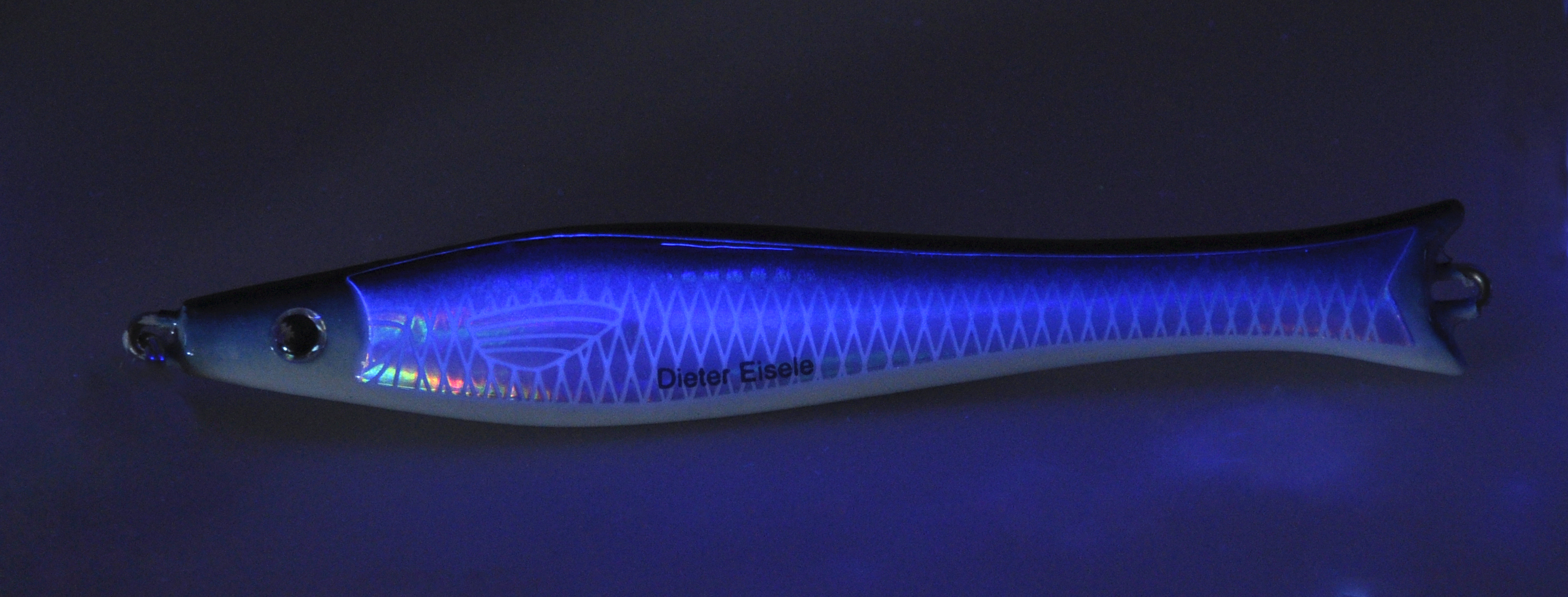 Die Pro-UV-Pilker sind mit einem Marvel-Shining-Auge versehen, das ultraviolett scheint. Menschen sehen diese Wellenlänge des Lichts unter Schwarzlicht. Der Fisch in der Tiefe sieht es ähnlich: Die Augen "leuchten". Das UV-Auge erscheint im flachen Wasser holografisch silber und reflektiert das Licht. Im dunklen, tiefen Wasser leuchtet ultraviolettes Rot. Eine High-Tech-Entwicklung des Eisele-3D-Augen- und Folienherstellers. Es geht noch weiter! Die 3D-Holografik-Folie ist als die beste im Pilker-Segment bekannt. High-Tech aus der Photovoltaik-Industrie im Pilkerbau. Die holographischen Schuppen reflektieren die Sonnenstrahlen in den Spektralfarben. Im dunklen tiefen Wasser leuchten diese silbernen Schuppen ultraviolett blau/grün, wie die Nordlichter in Norwegen. Diese Auswahl an Pro-Select-Pilkern ist die Zukunft.